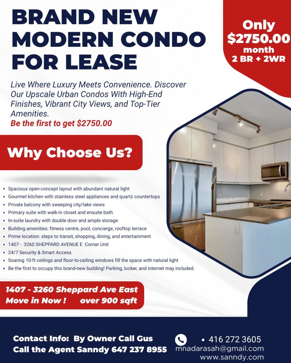 Brand New Condo for Rent 2Br+2WR Warden/Sheppard $2750/month + $50 Gift card